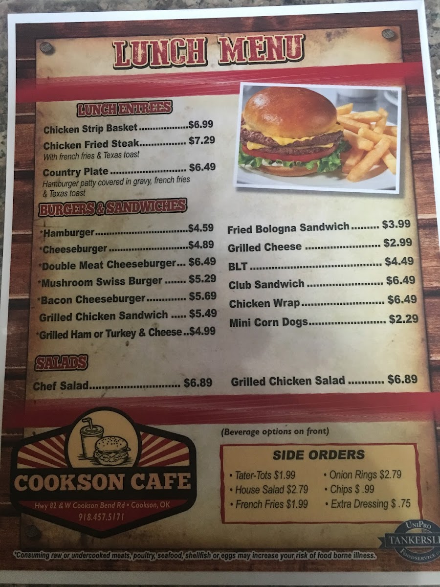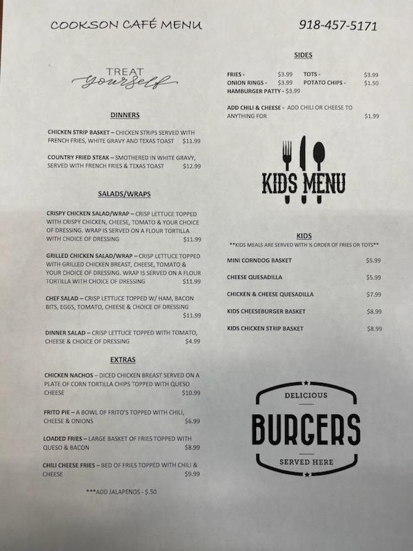 Welcome to Cookson Cafe, a charming spot nestled in the heart of Cookson, Oklahoma. This delightful cafe is the perfect destination for breakfast and lunch enthusiasts alike. The menu boasts a variety of mouthwatering options, ensuring there's something for everyone.